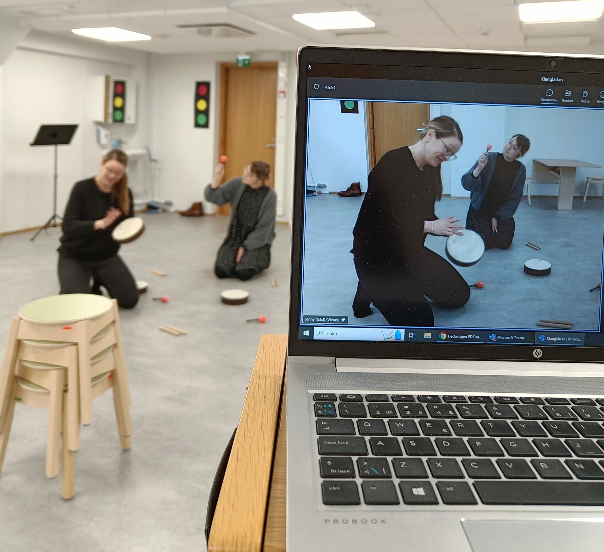 Klanglådan är ett nytt verktyg för den som vill ha inspiration och idéer för musiklek med 3-8-åringar! Allt material finns tillgängligt digitalt på Klanglådan.fi och en fysisk klanglåda med instrument är möjlig att boka kostnadsfritt. Distansdeltagarna fick under workshoparna bekanta sig med två av de teman som finns i Klanglådan, rymden och våren.